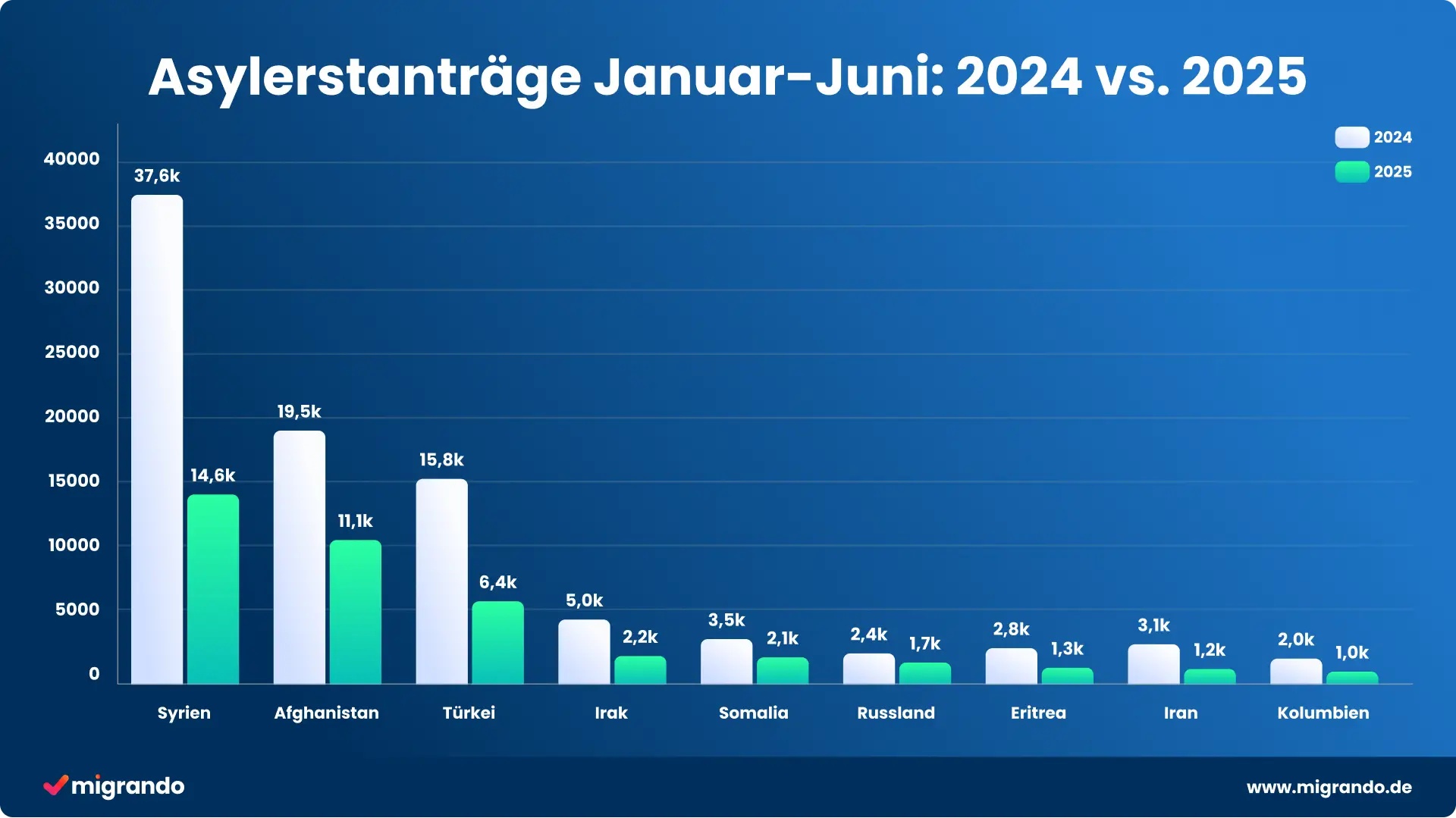 The decline in Syrian asylum seekers is particularly sharp: In the first half of 2025, only 14,633 Syrians applied for asylum in Germany - compared to 37,633 in the same period in 2024.