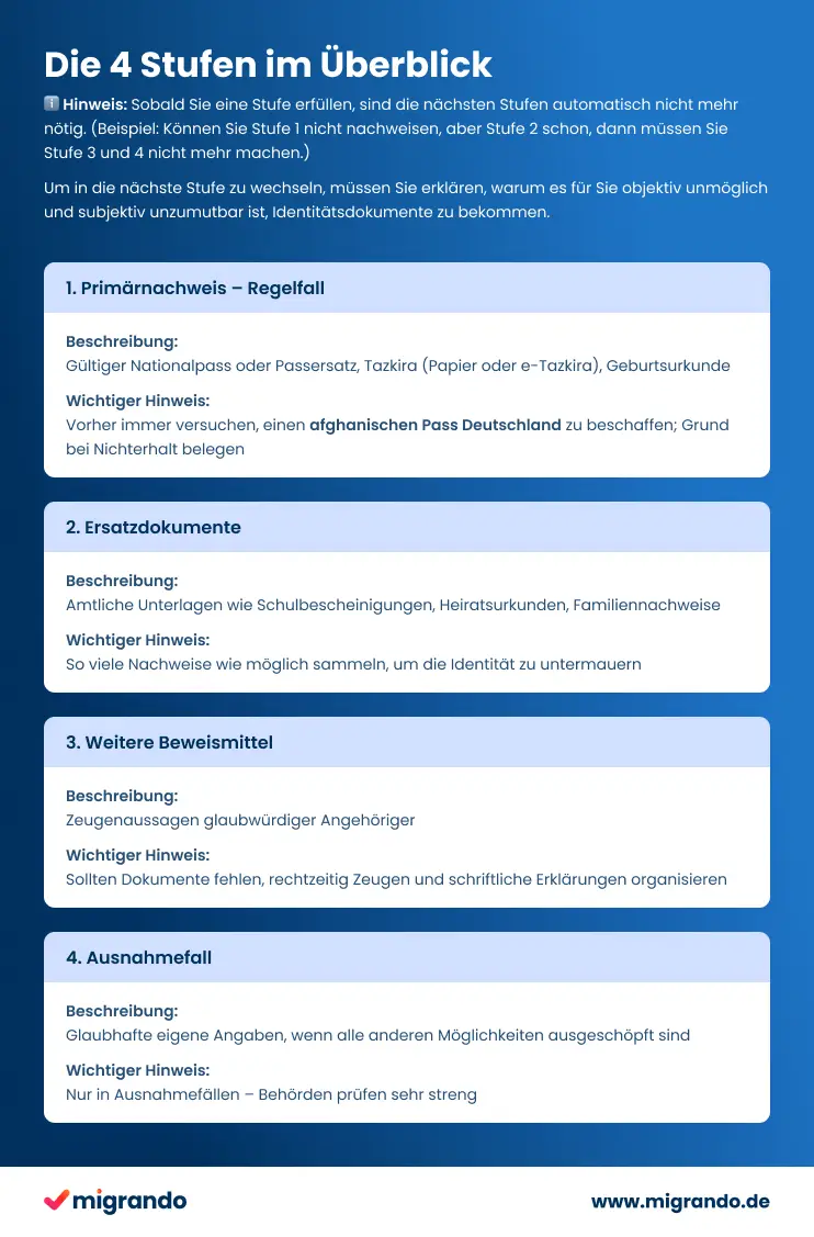 Если для натурализации или процедуры получения вида на жительство не удается представить афганский паспорт или его заменитель, немецкие власти применяют пошаговую модель, разработанную Федеральным административным судом (решение от 23.09.2020, Ref. 1 C 36.19). пошаговая модель применяется.