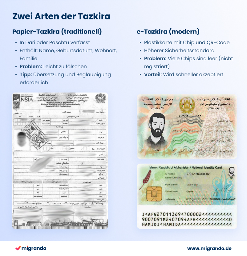 Тазкира - самый важный афганский документ, удостоверяющий личность. Она служит официальным подтверждением личности и гражданства и обычно является обязательным условием для подачи заявления на получение афганского паспорта в Германии. Афганские дипломатические представительства за рубежом не выдадут паспорт без действующей тазкиры.
